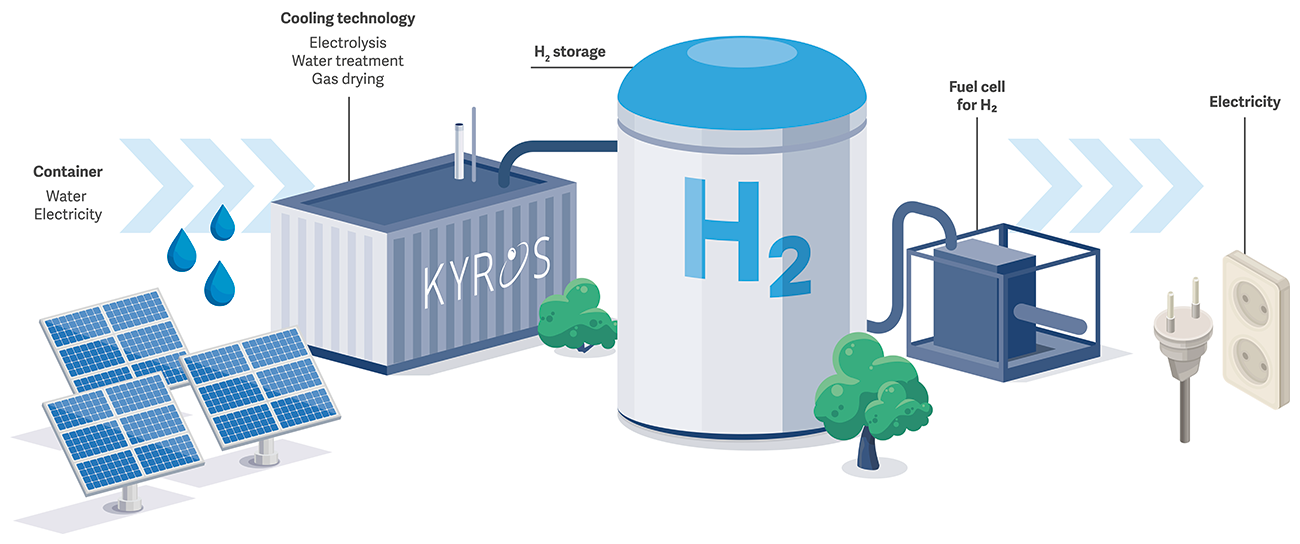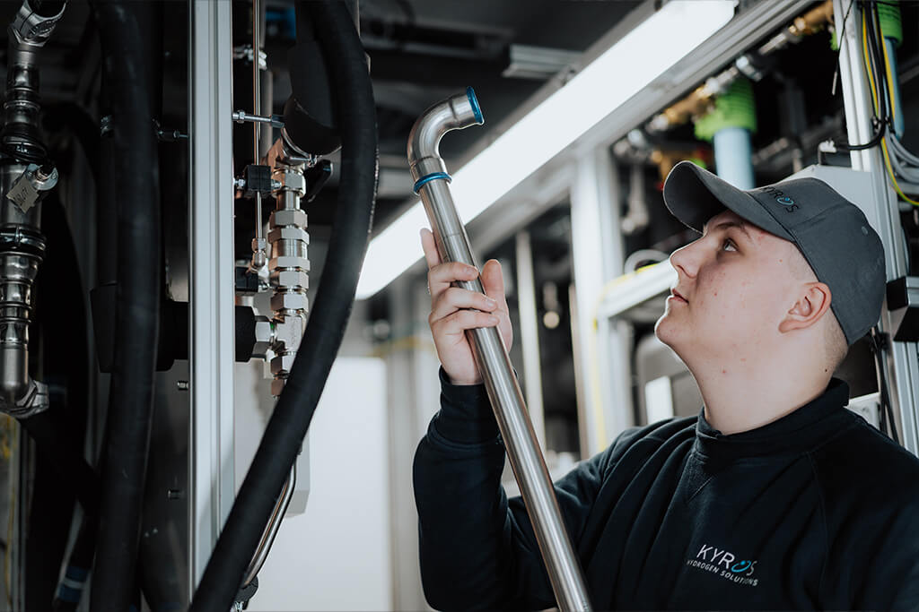 To ensure the stack’s longevity and the most efficient reaction process possible, we use ultrapure water instead of conventional tap water. This is supplied to the system by our water treatment system. Regular tap water serves as the standard starting material. However, Kyros also offers the option of using well or rainwater to find the best possible solution for each customer’s specific application.